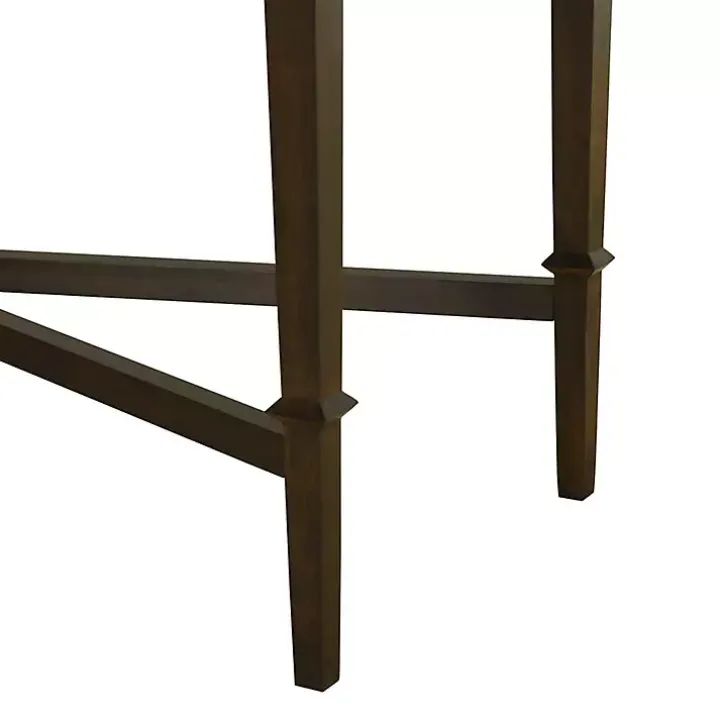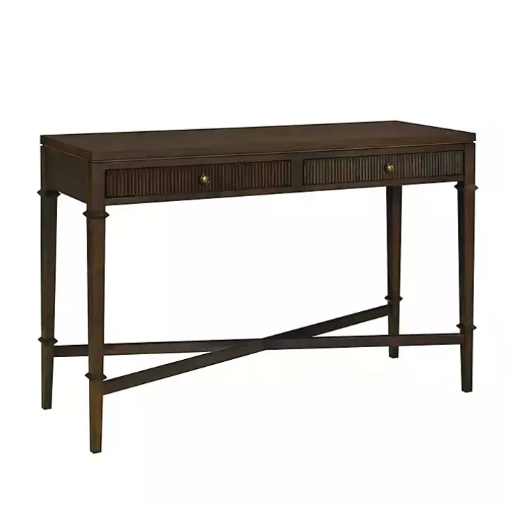 Enhance your space with this classic Martha Stewart Brown Console Table. Its fluted faced drawers and antique brass knobs give it a timeless style that’s perfect for your vintage collection.