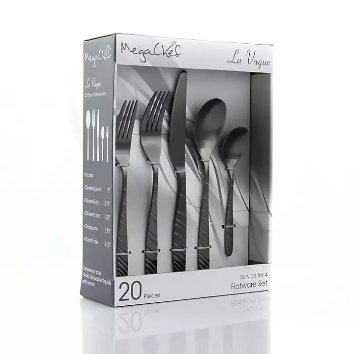 Express your modern sense of style down to the last detail! You’ll love eating meals with the sleek, industrial look of this Matte Black Steel Diagonal 20-pc. Flatware Set!