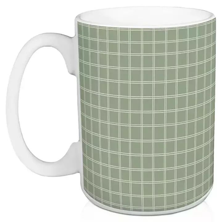 - Mug B features a plaid background with a puppy in a Christmas stocking that reads “Merry Woofmas”