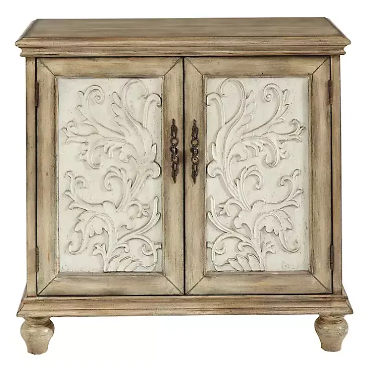 Update your rustic decor with our Natural and Cream Two-Tone Whitt Cabinet! Its intricate door design front feels rugged with its distressed finishes. You’ll love the way this piece brightens up your space and adds extra storage!