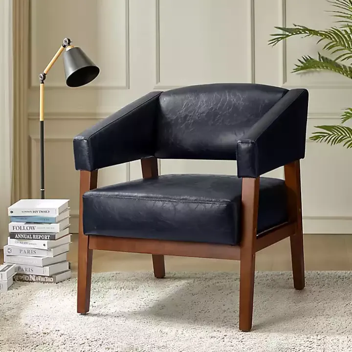 Refresh your space with mid-century modern sophistication! This Navy Faux Leather Nicki Accent Chair will effortlessly elevate any room in your home, from your office to your seating area.