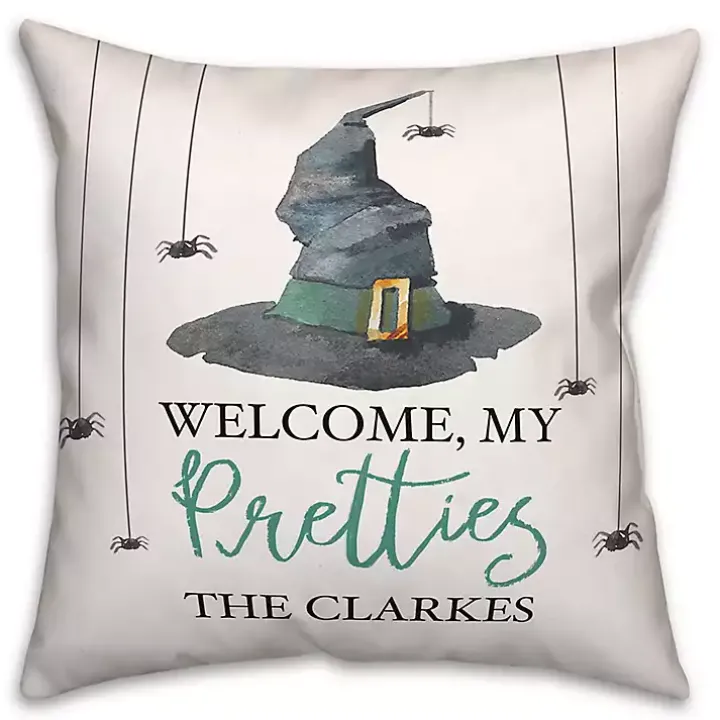 Greet your guests in a bewitching way with this Personalized Welcome My Pretties Outdoor Pillow. Accented with spiders and a witch hat, it’s sure to add a spooky touch wherever it goes!