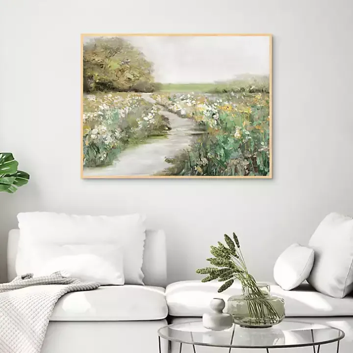 Enjoy a peaceful view of nature with the Quiet Meadow Framed Canvas Art Print. The fresh green field dotted with white and gold flowers will bring your walls to life!
