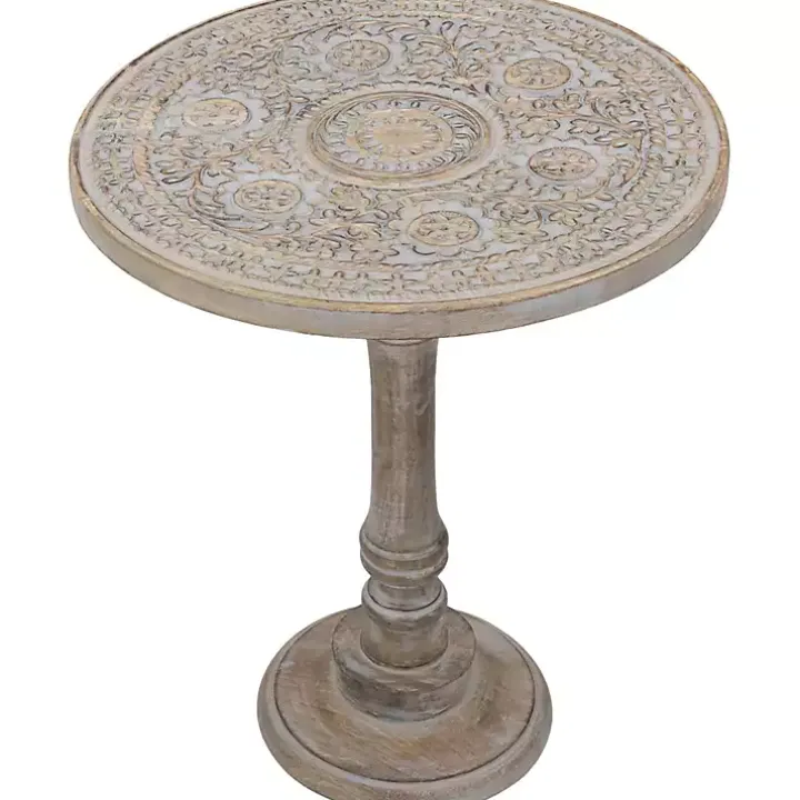 Bring a sense of rustic elegance to any space with the Round Antique Gray Etched Pedestal Accent Table. Detailed with beautiful botanical patterns, it will look lovely with boho and farmhouse decor!