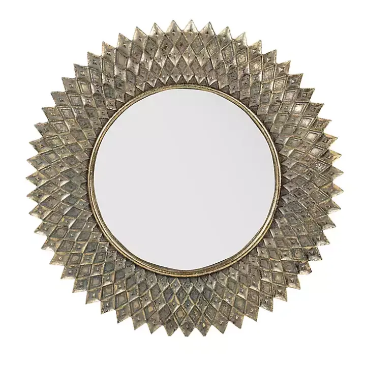 With a lavish design and radiant finish, this Round Gold Textured Diamond Wall Mirror makes a brilliant addition to any room. Its antique look will instantly elevate your decor!