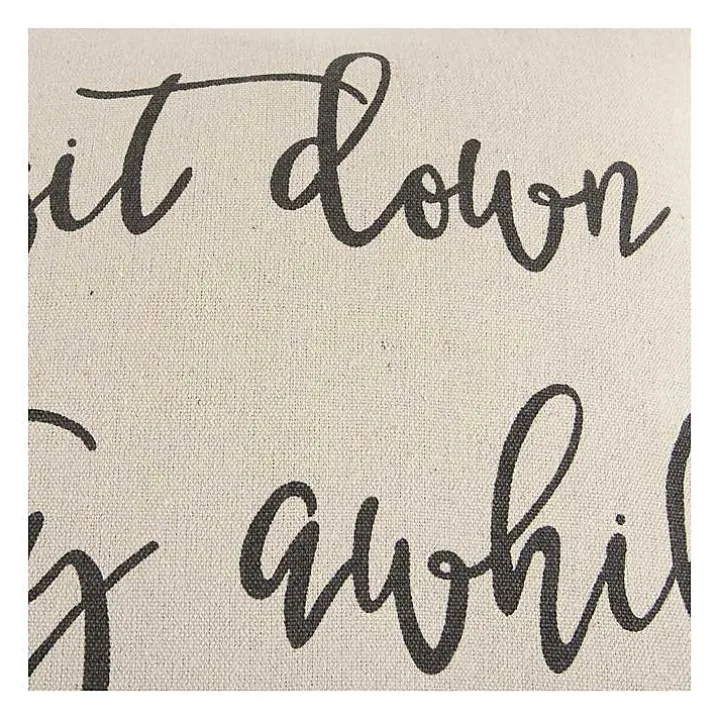 - Features the phrase “sit down stay awhile” in rustic black print