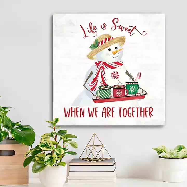 - Features the phrase “Life is sweet when we are together” and snowman design