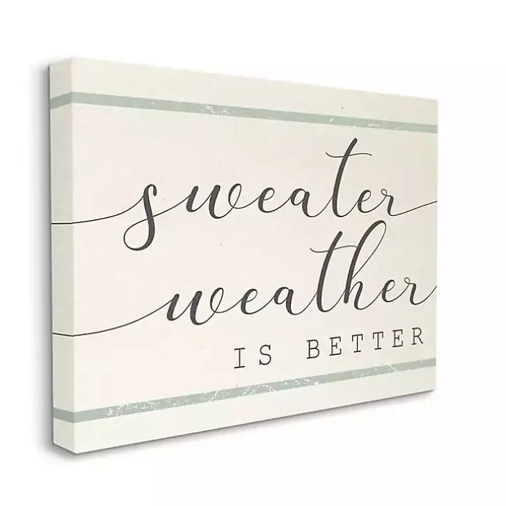 Cant get enough sweater weather? The Sweater Weather Is Better Canvas Wall Art will have you dreaming of pumpkin spice and all things nice this autumn.