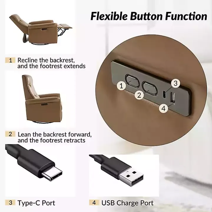 This Val Brown Faux Leather Swivel Power Recliner has your back, literally! This recliner is perfect for laying back and relaxing, plus it has the ability to charge your devices. Its stylish design will elevate the look of any room in your home!
