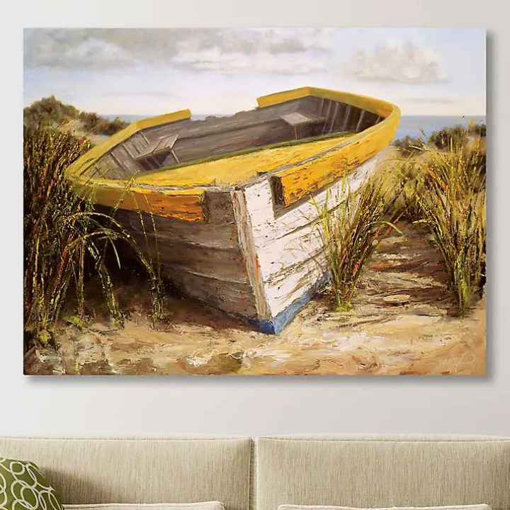 Make your space feel like a warm, sunny day with this Vineyard Launch Canvas Art Print! Featuring a rowboat accented in yellow, this piece is sure to create joy on any wall.