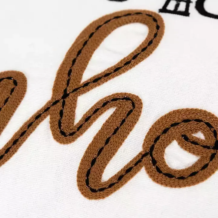 - Features the phrase “Welcome to our Farmhouse” in embroidered letters