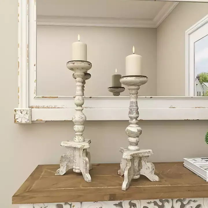 Add a vintage look to your space with these White Chipped Wood Pillar Candle Holders. Paired with candles, you’ll love the soft, warm ambiance they create in your home!
