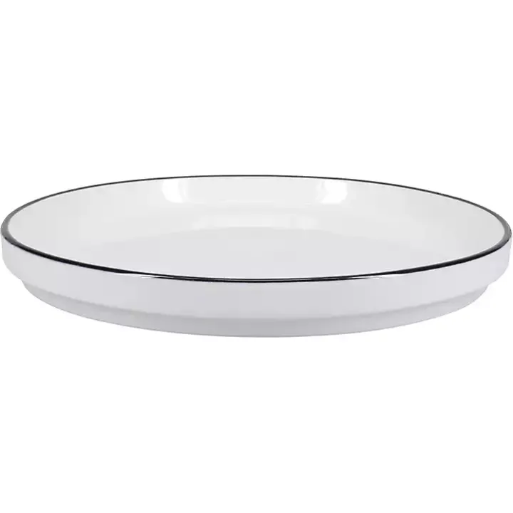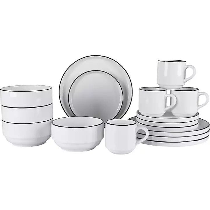 Impress your dinner guests with a touch of simplicity and style! Our White with Black Rims 16-pc. Dinnerware Set feature a timelessly modern design that’ll go great with any meal. Plus, the convenient stackable design makes it easy to store this set when not in use.